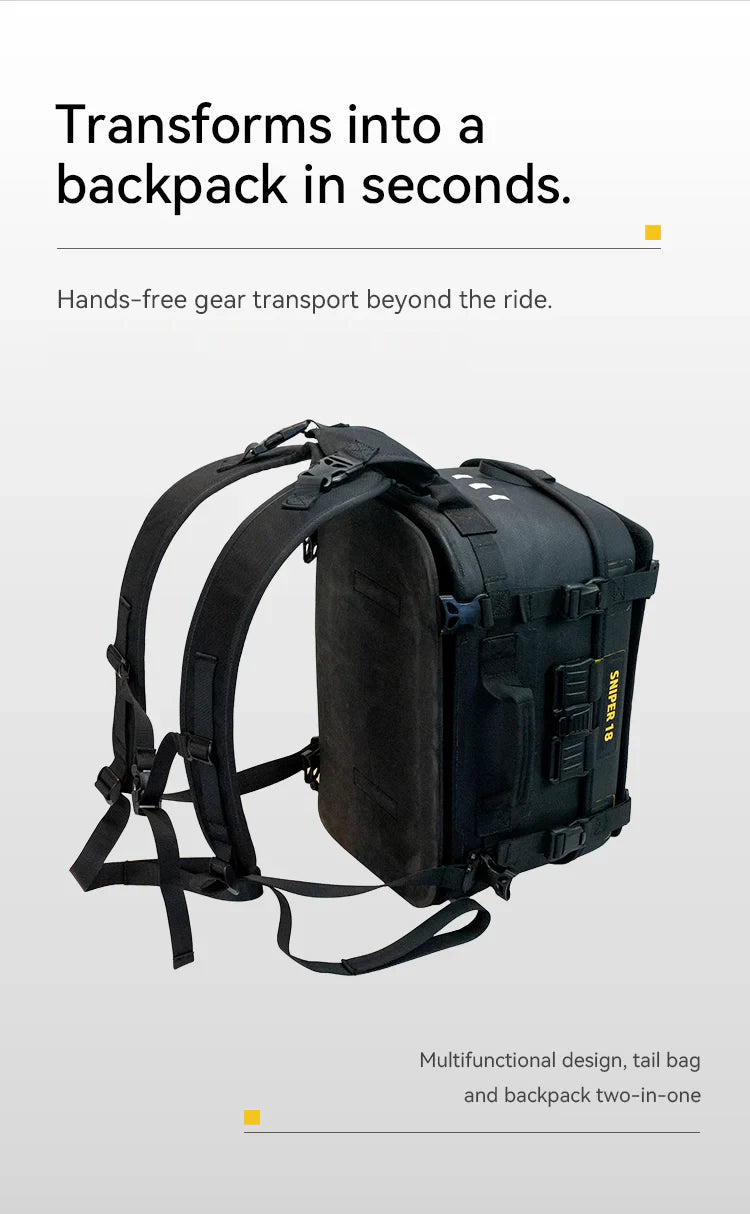 Die Sniper Tail Bag wurde ursprünglich für Fotografie-Enthusiasten entwickelt, die mit dem Motorrad reisen. Ihre kompakte Größe und das robuste Gehäuse bieten hervorragenden Schutz für Ihre Ausrüstung.