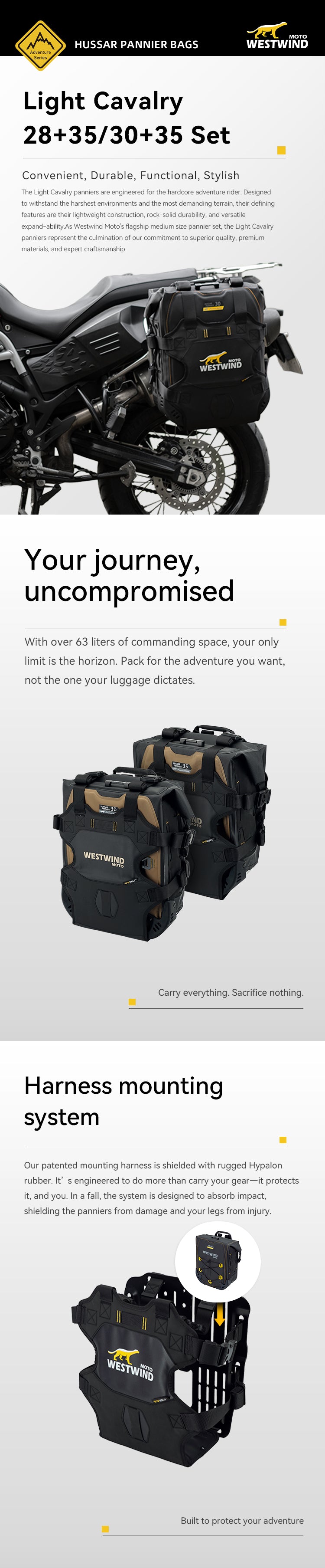 Introducing the Hussar Panniers Set, Westwind’s flagship adventure semi-rigid panniers designed for serious motorcycle travelers. Created to withstand the toughest conditions and environments, these panniers are lightweight, highly functional, durable, and designed with style in mind. The Hussar Panniers set offers reliable protection for your gear, easy expandability for additional storage, and a sleek, modern look. With its robust design and practical features, the Hussar pannier is ideal for long-distance riders and those seeking the perfect balance between toughness and convenience.