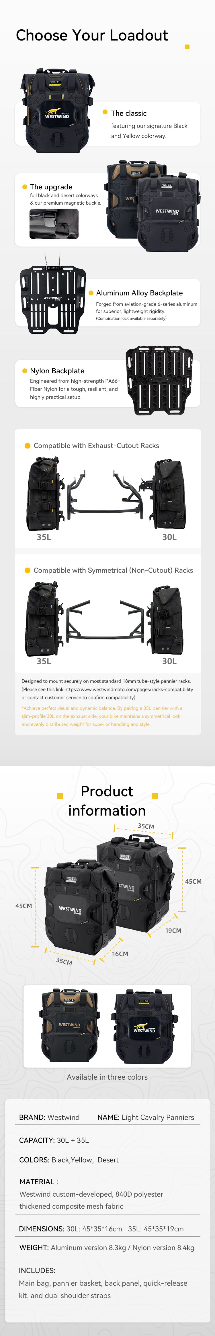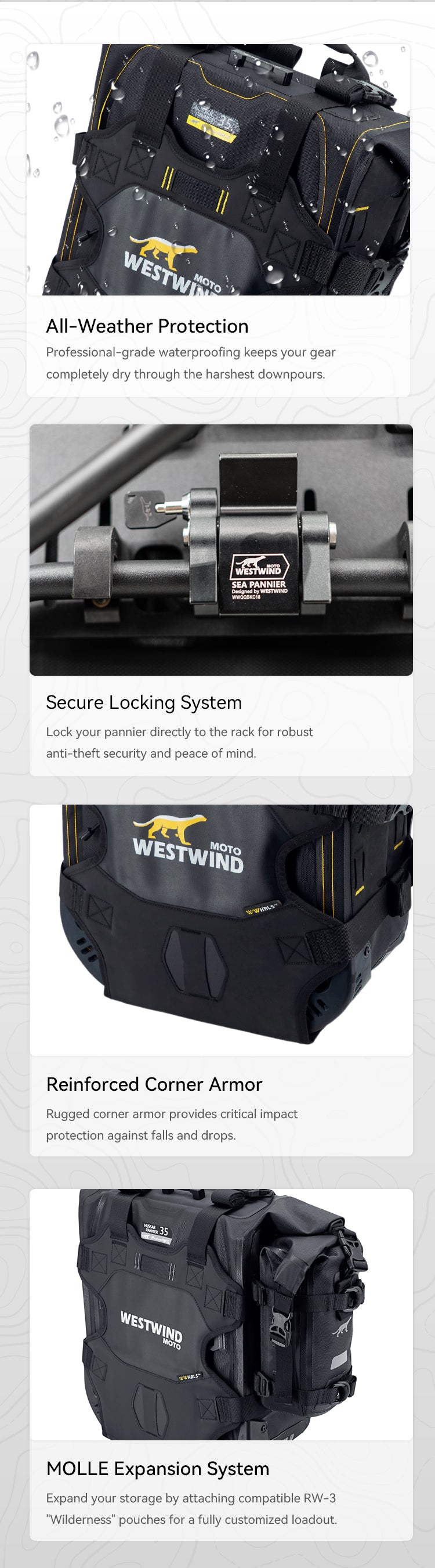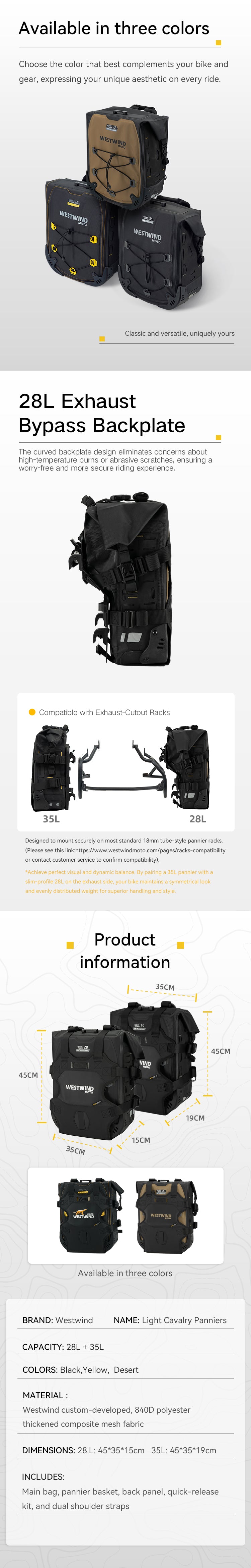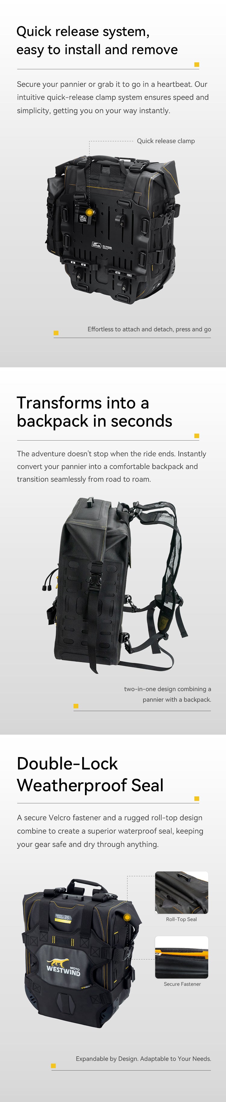 • Highly Expandable: The panniers feature RW3 expansion side bags on both sides, offering additional storage capacity when needed. "Harness Mounting System": Westwind’s patented "Harness" system securely connects the pannier to the backplate, allowing you to quickly install and remove the pannier without needing to detach the backplate. This system maximizes convenience and flexibility, ensuring the pannier stay secure even in rough terrain. The surface of the harness is covered in durable Hypalon rubber, providing additional protection for your pannier—even in the event of a fall. The pannier also includes hidden shoulder straps for easy carrying when off the bike.
