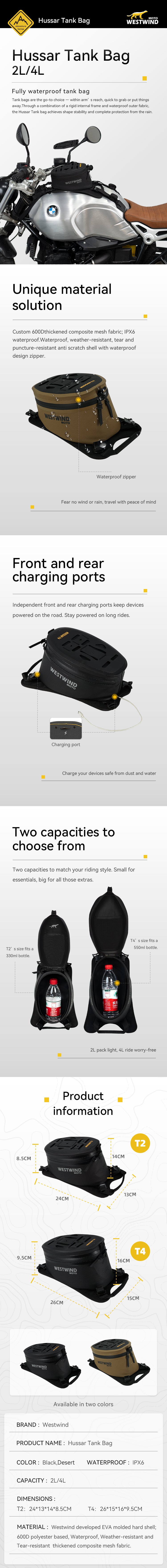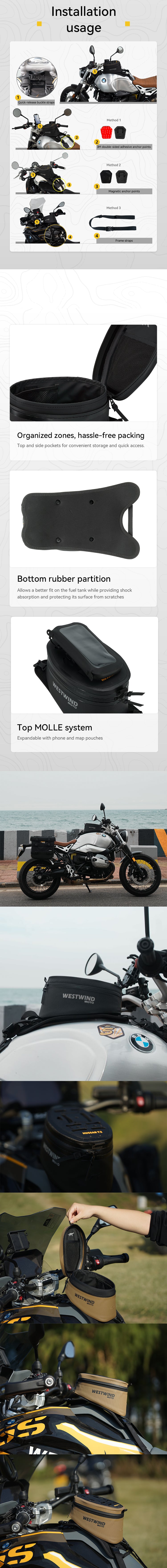 The Hussar Tank Bag is designed for everyday riders who need a convenient, compact, and waterproof solution to carrying your phone, power bank, or snacks. This bag provides quick and easy access to your essentials while on the road. Unlike many other tank bags that require an additional rain cover, the Hussar Tank Bag is built with rigid internal materials for support and features a fully waterproof fabric exterior. This ensures that the bag maintains its shape and offers complete protection from rainwater infiltration. With three mounting options available, it is universally adaptable to any motorcycle, allowing you to customize the fit based on your tank shape and motorcycle design.