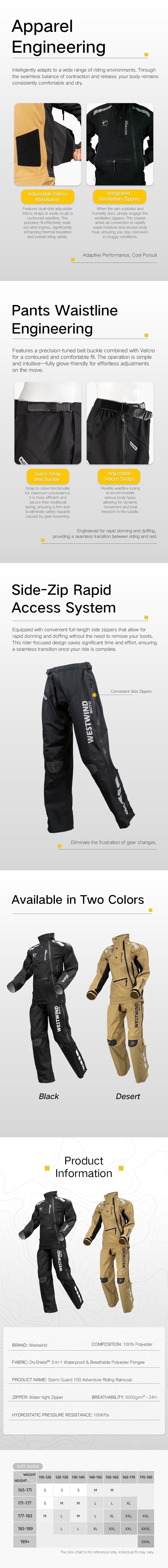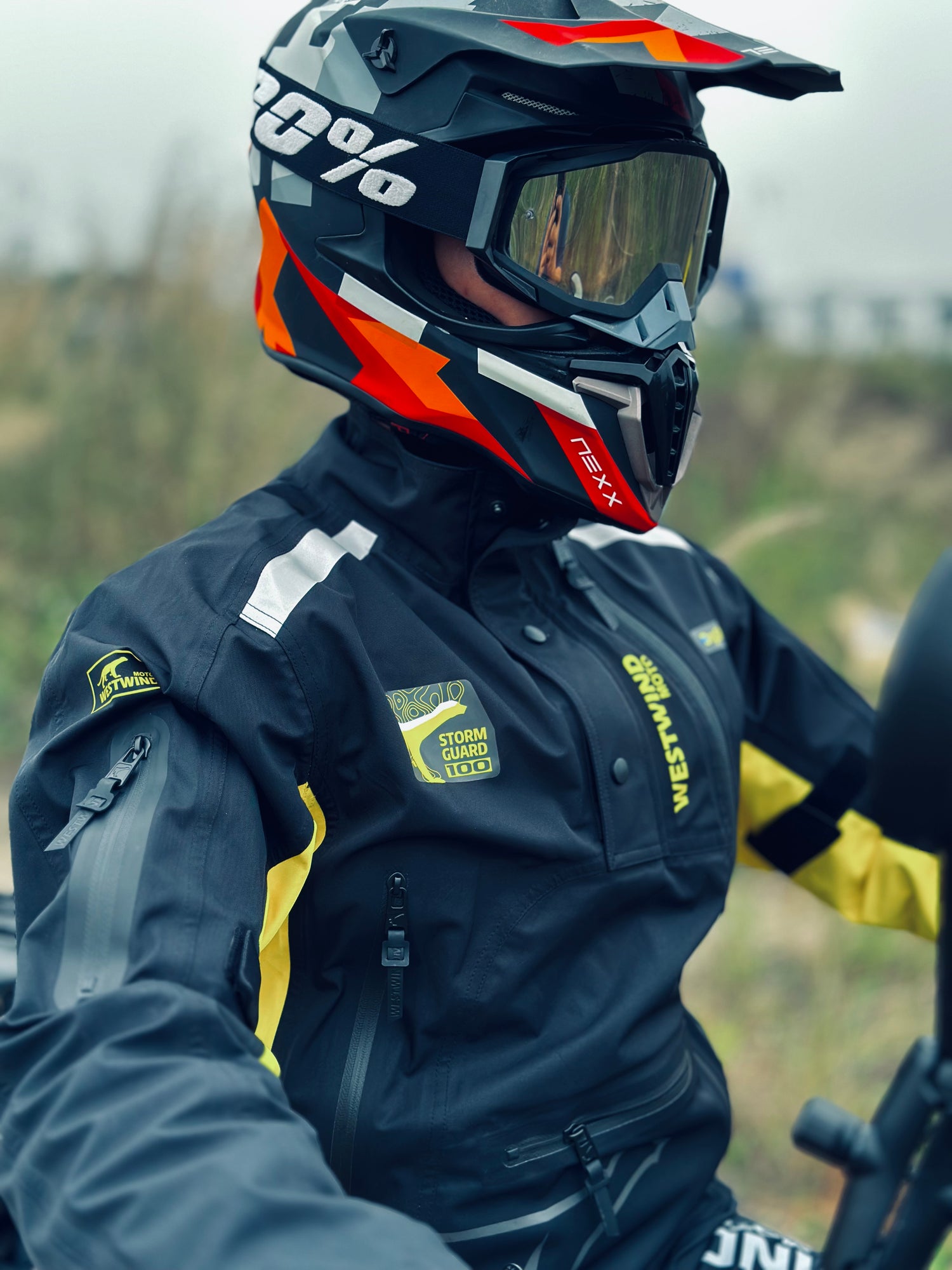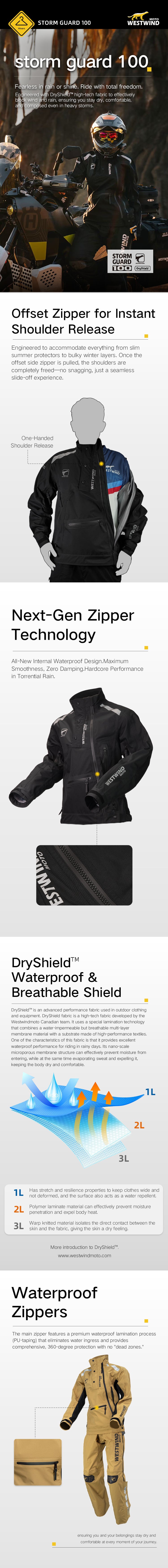 The STORM GUARD100 uses DryShield high-tech fabric and employs a special lamination technology that combines a multi-layer membrane material, which is waterproof yet breathable, with a high-performance textile base. One of the key features of this fabric is its excellent waterproof performance, specifically designed for rainy-day riding. The nanometer-scale microporous membrane structure effectively prevents water from entering, while allowing sweat to evaporate and be expelled, keeping the body dry and comfortable.